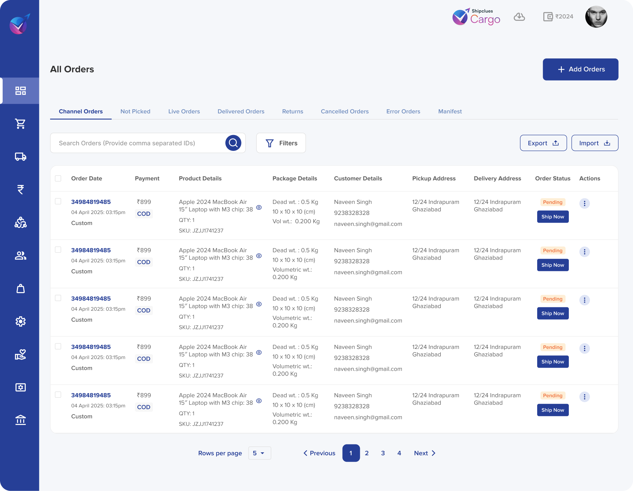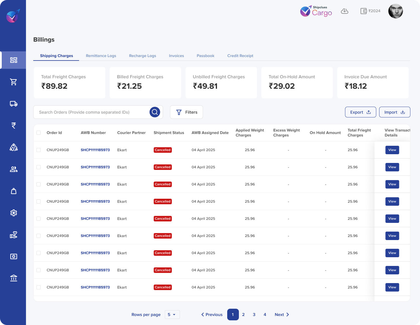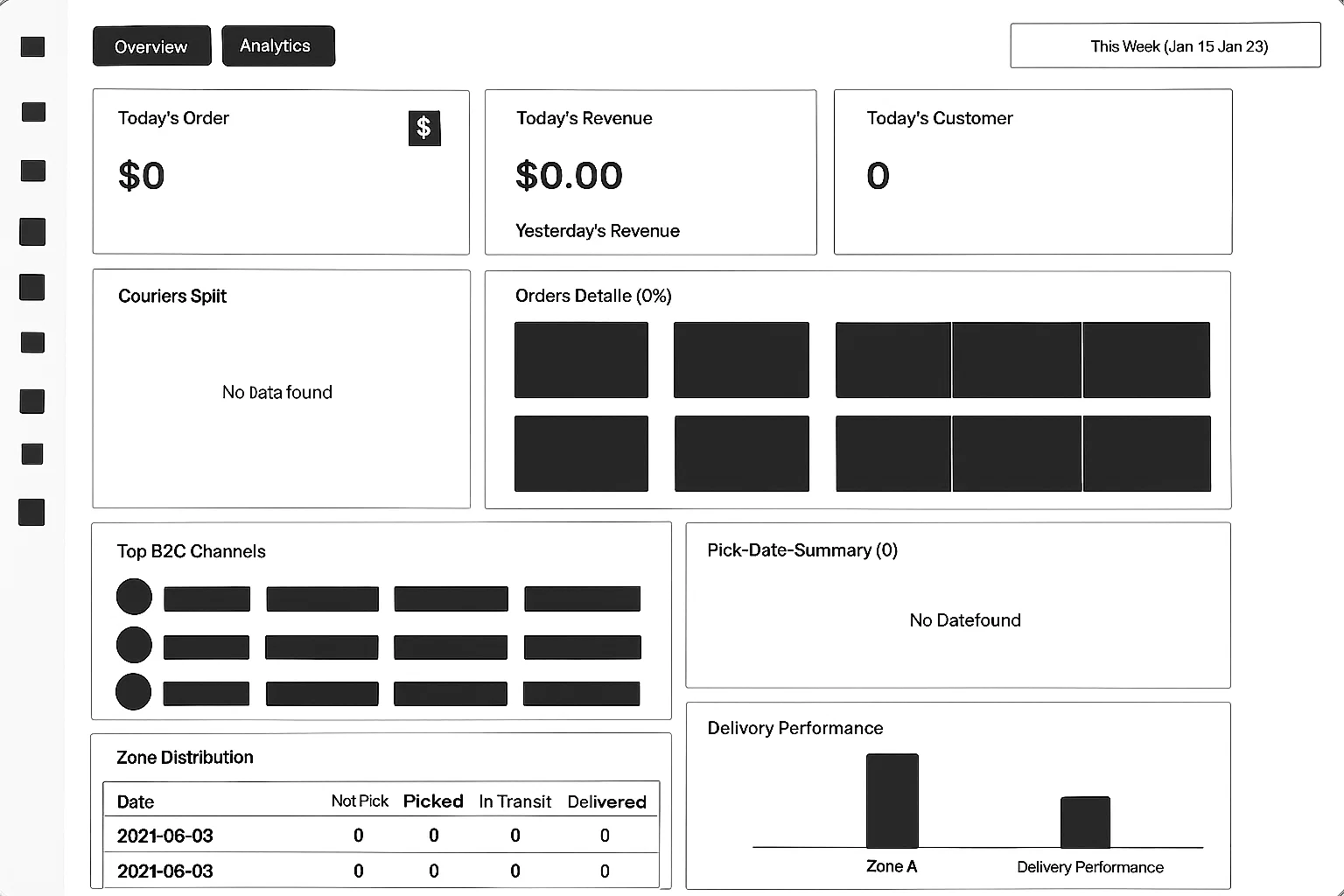 - Overview Cards for “Pending Pickups,” “In Transit,” “Exceptions”
